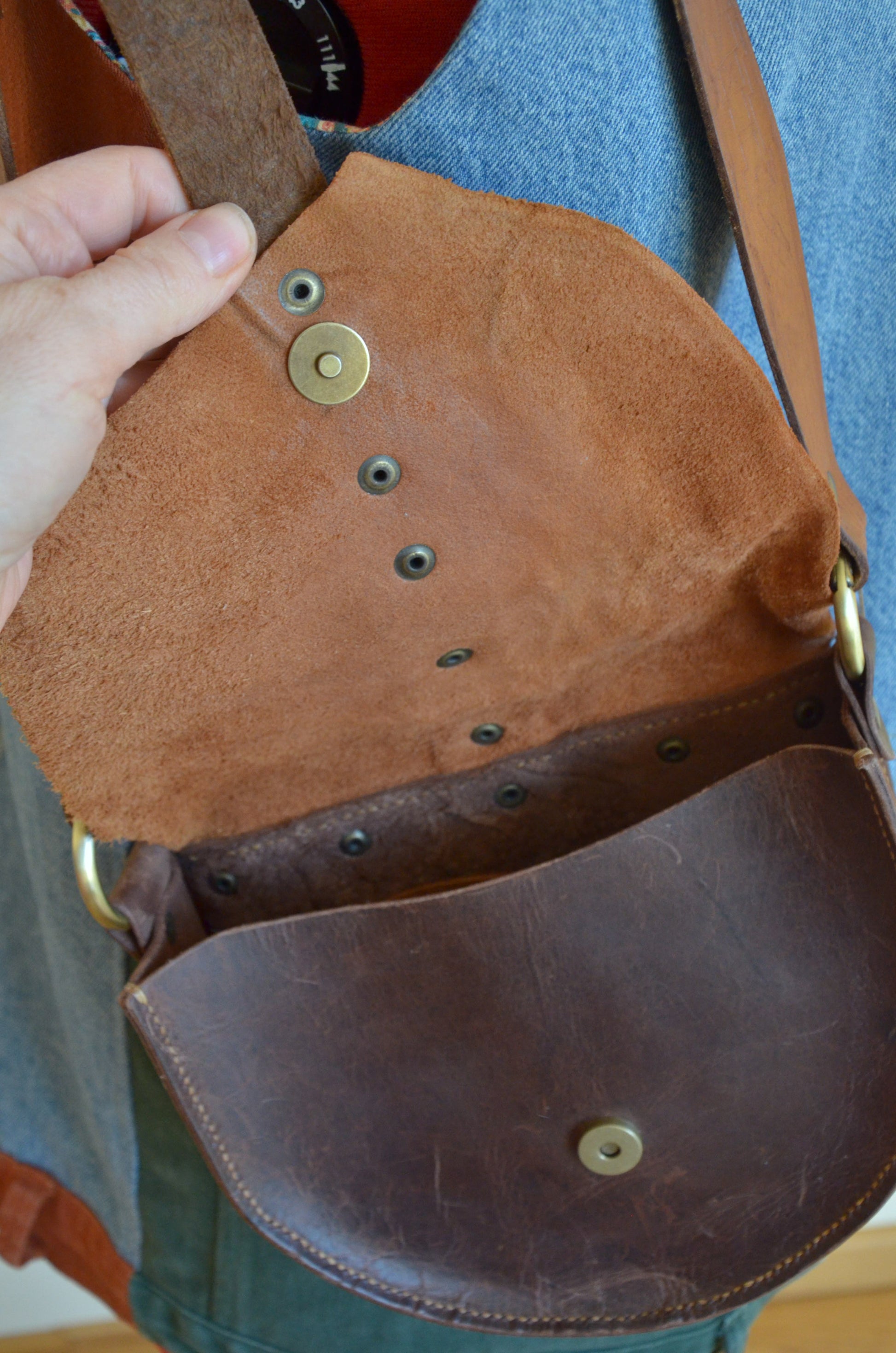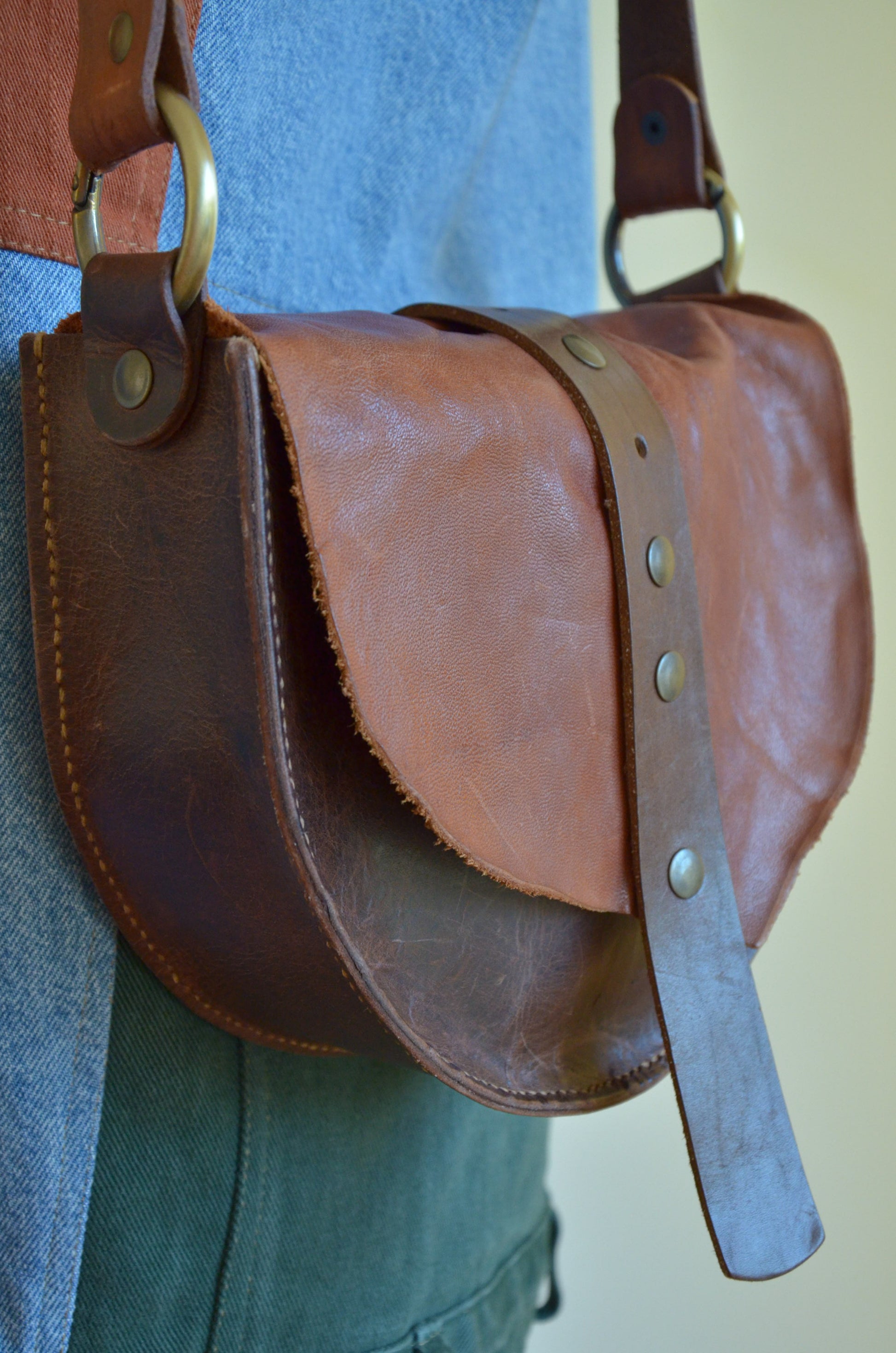 This bag is made out of leather scraps and old belts. I initially got these scraps because they were defective and couldn't be used for production of leather items. But I saw the beauty in their imperfections and wanted every piece, every uneven edge, to show. The leather belt was thrift find; it makes the piece look vintage, more aged.