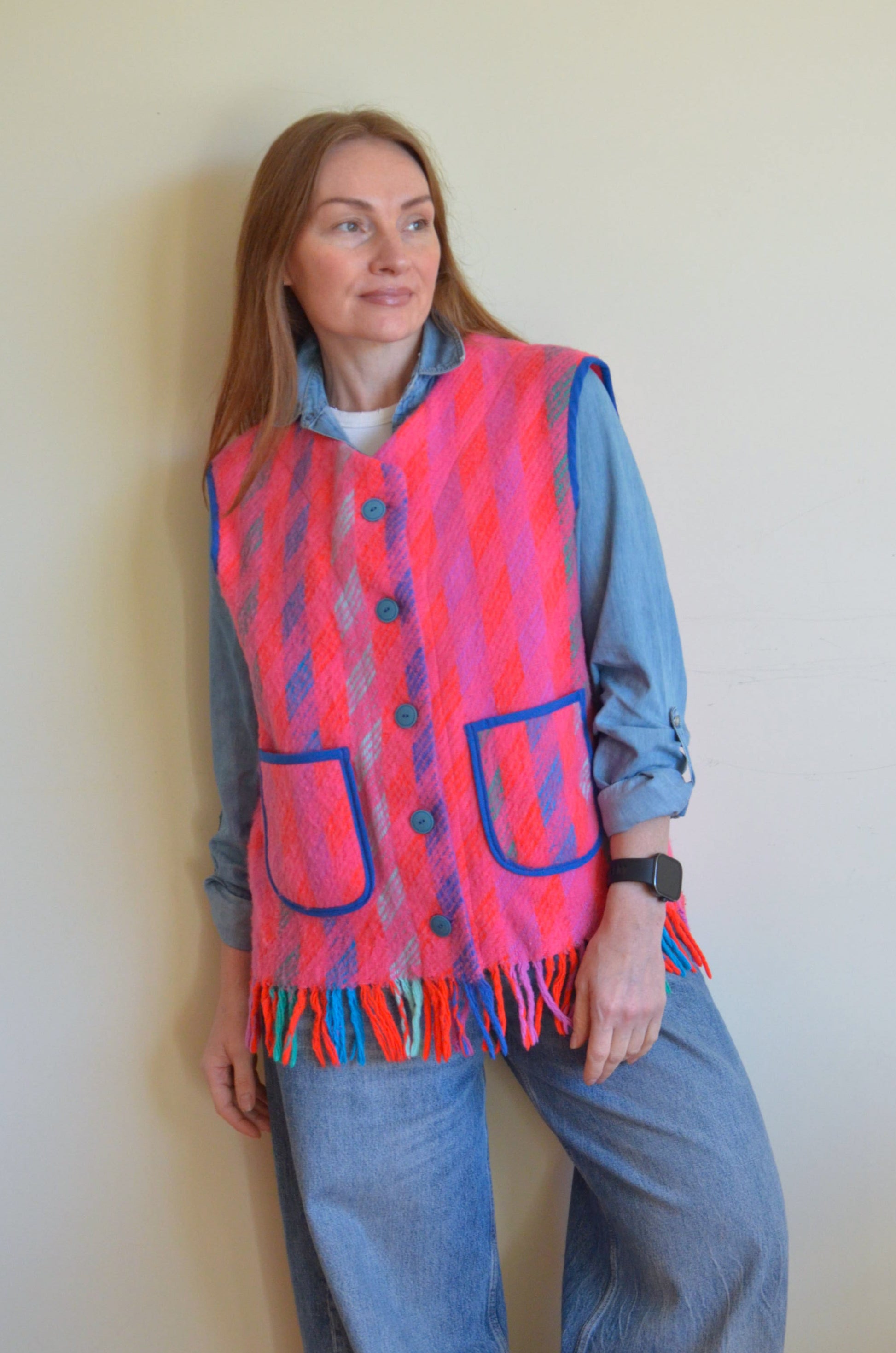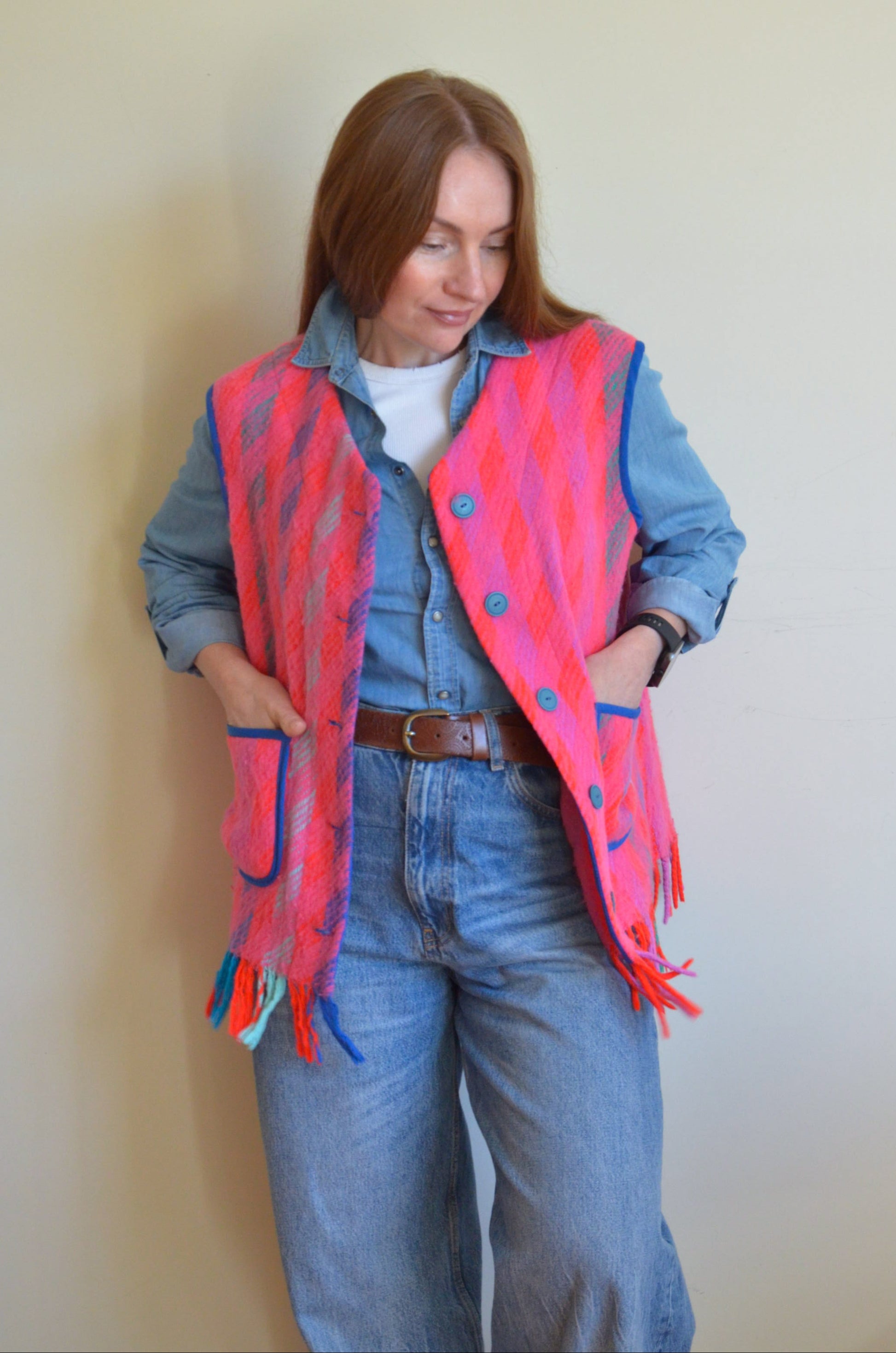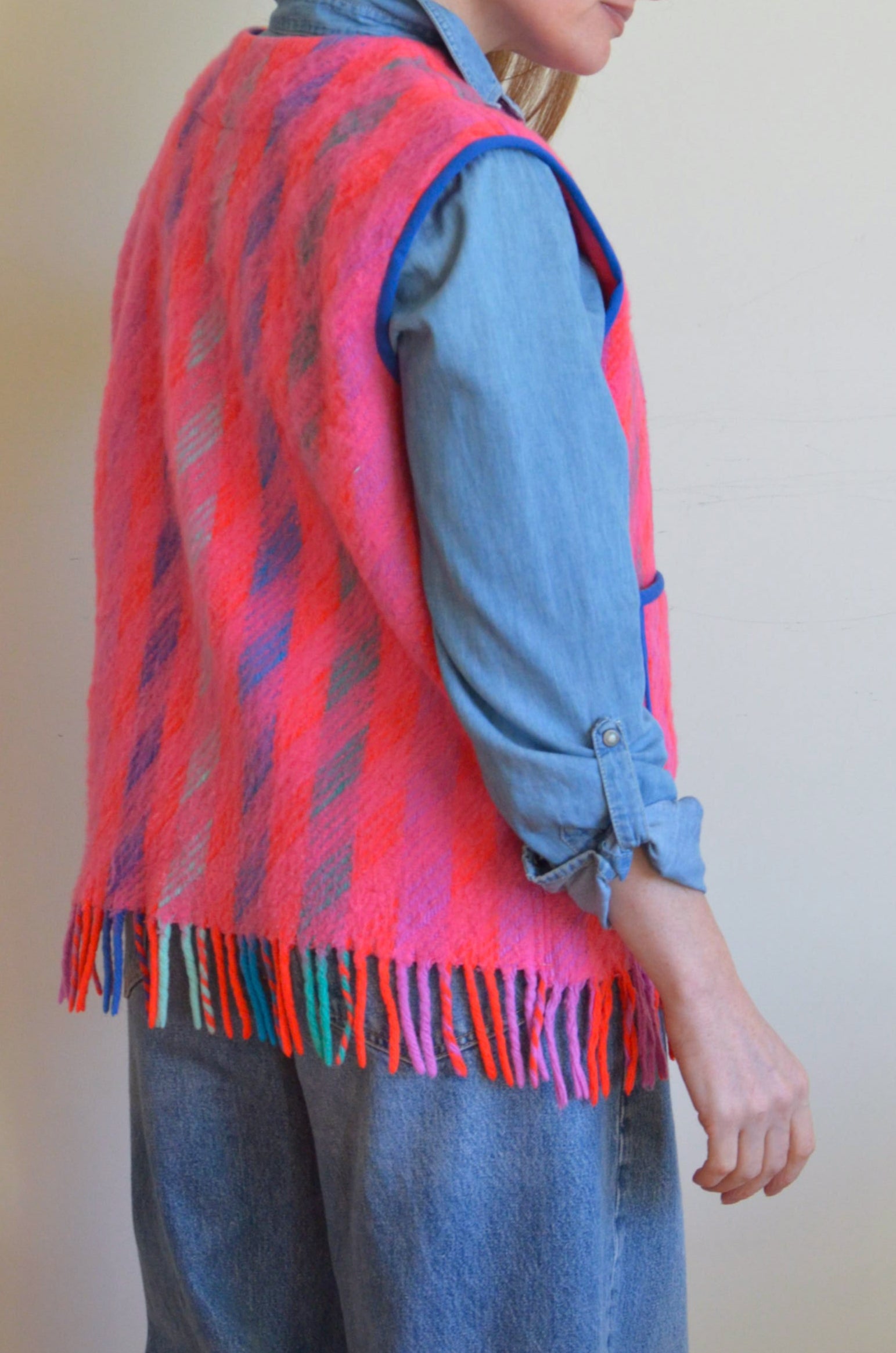 This bright vest is perfect for any season. It's handcrafted from a blanket.